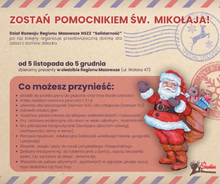 Dział rozwoju Regionu Mazowsze NSZZ "Solidarność" organizuje przedświąteczną zbiórkę dla dzieci z domów dziecka.
